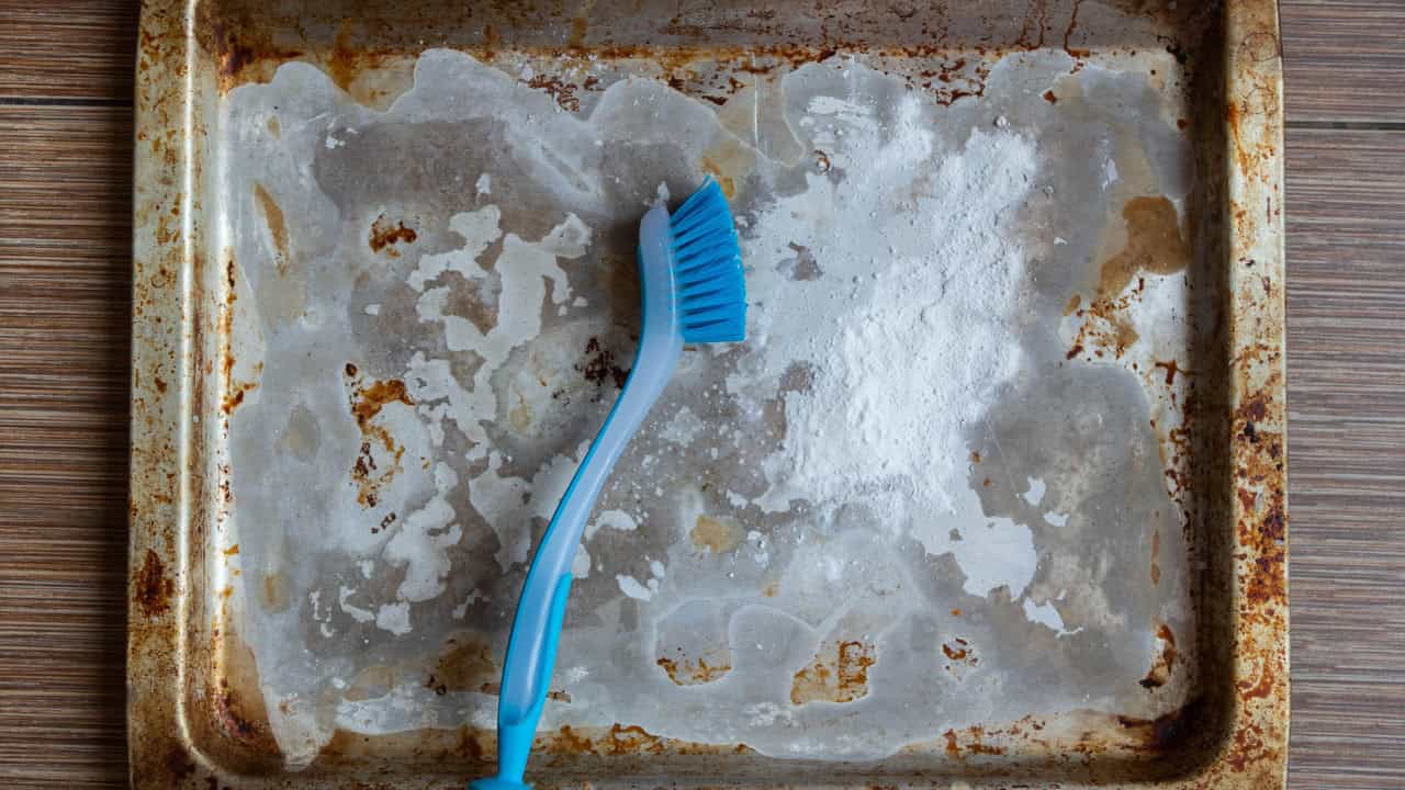 If your baking sheets look like they’ve survived a hundred burnt cookies and greasy sheet pan dinners, don’t toss them just yet. A simple mix of baking soda and hydrogen peroxide can work wonders. Sprinkle baking soda over the sheet, spritz on some hydrogen peroxide, then add another layer of baking soda. Let it sit for a few hours while you do literally anything else.