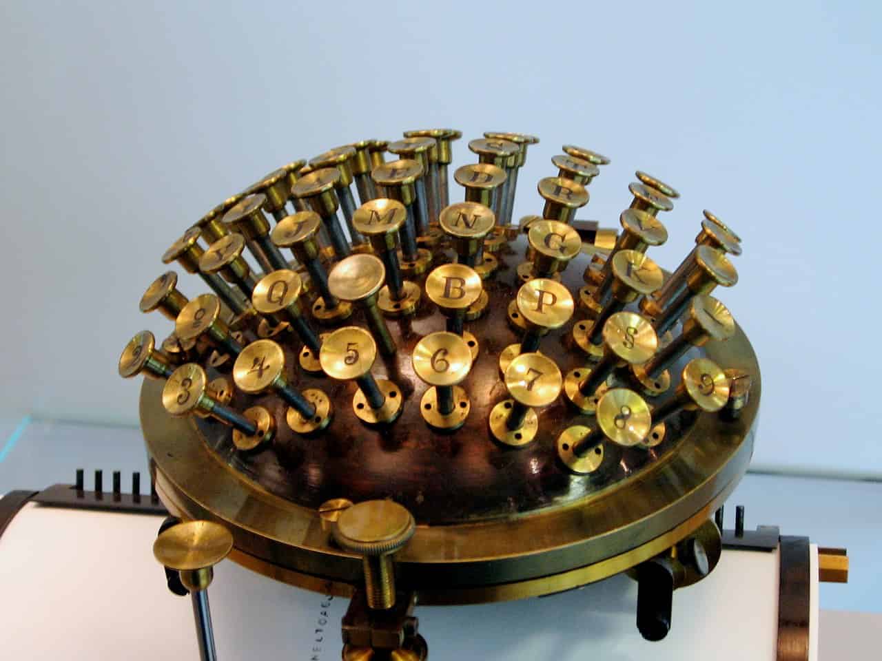 This unique machine features 52 keys arranged on a brass hemisphere, making it look quite unusual compared to typical typewriters. Because of its rare design, it could gain significant value over time.