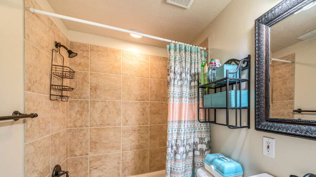 - Use a tension rod shower shelf or wall-mounted storage instead of hanging heavy items on the showerhead.