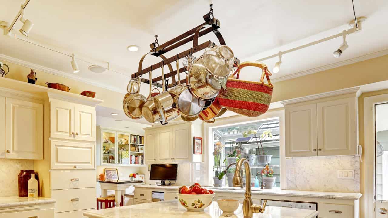 Hanging pots and pans on a rack or hooks can free up a substantial amount of cabinet space. It’s an ingenious solution that transforms unused overhead space into a functional area.