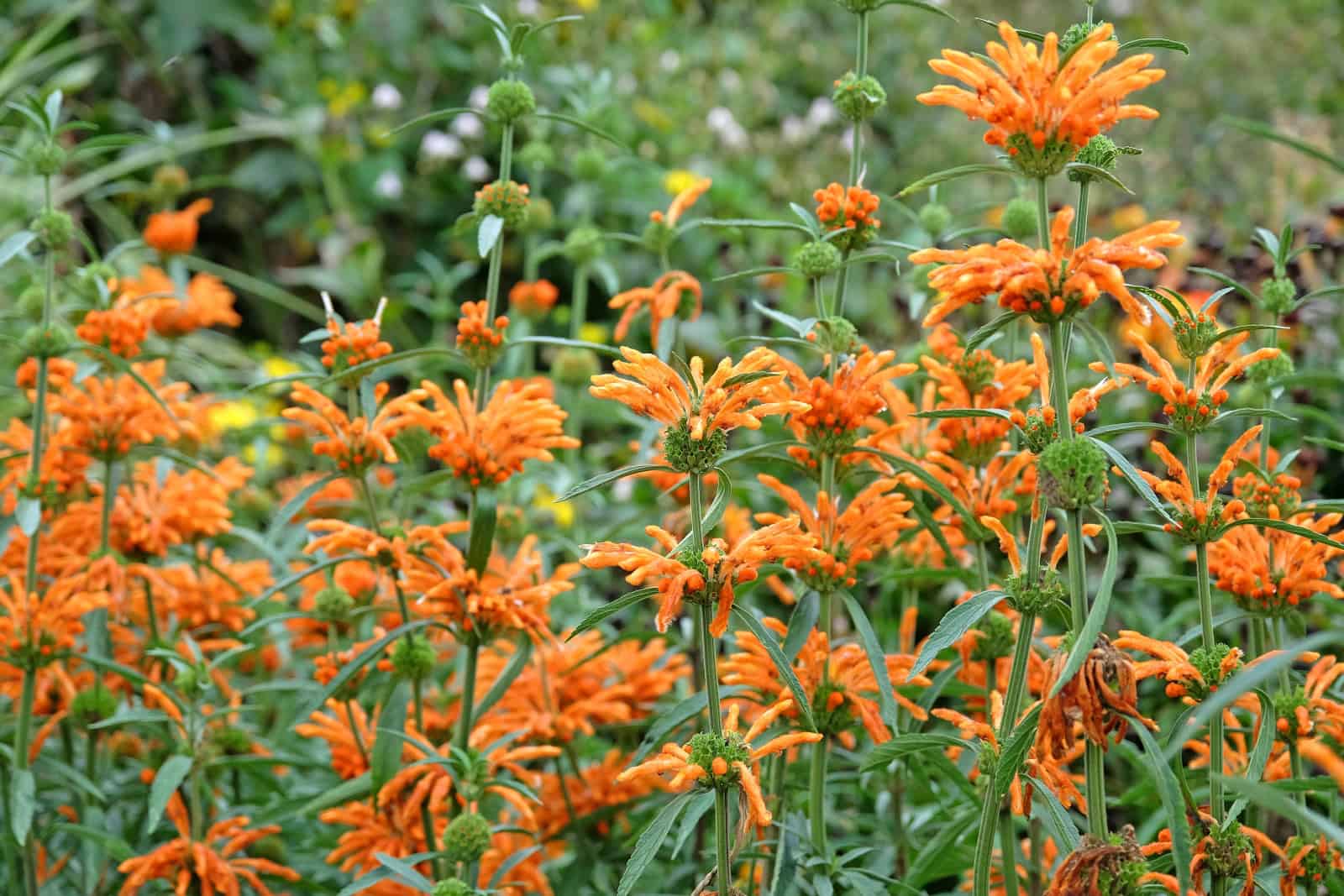 Fuzzy orange flowers grow in spherical shape along the stem of this plant. It creates an impression of a lion’s tail resulting in its name. The nectar-rich blooms attract birds and bees. Cutting down older flowers helps more blooms throughout the summer and fall seasons.