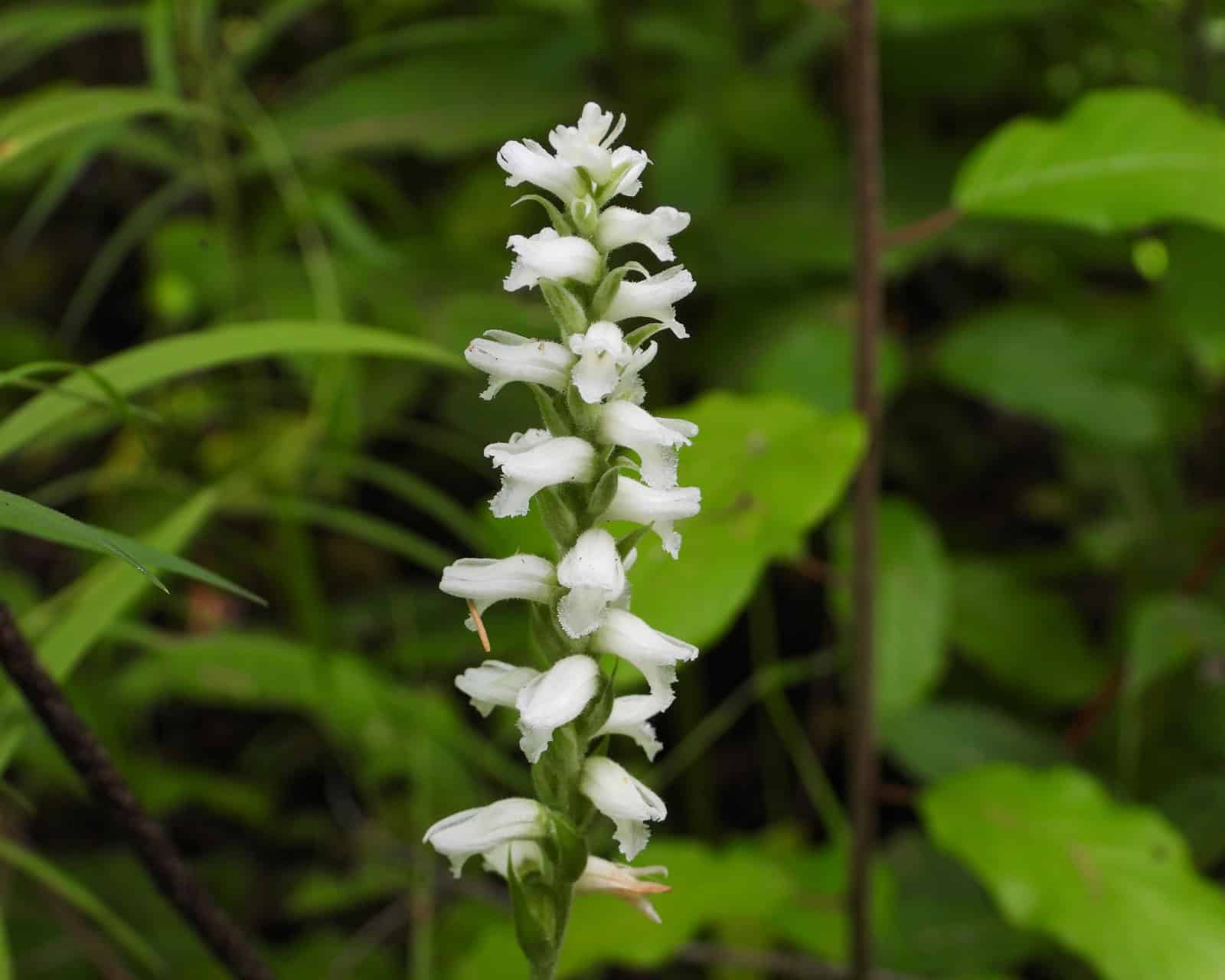 This delicate perennial has fragrant, bell-shaped white flowers that appear to spiral around the flower stem. It resembles the intricate hairstyle of a Victorian lady. The dark green, rosette-like leaves complete its graceful, old-fashioned appearance.