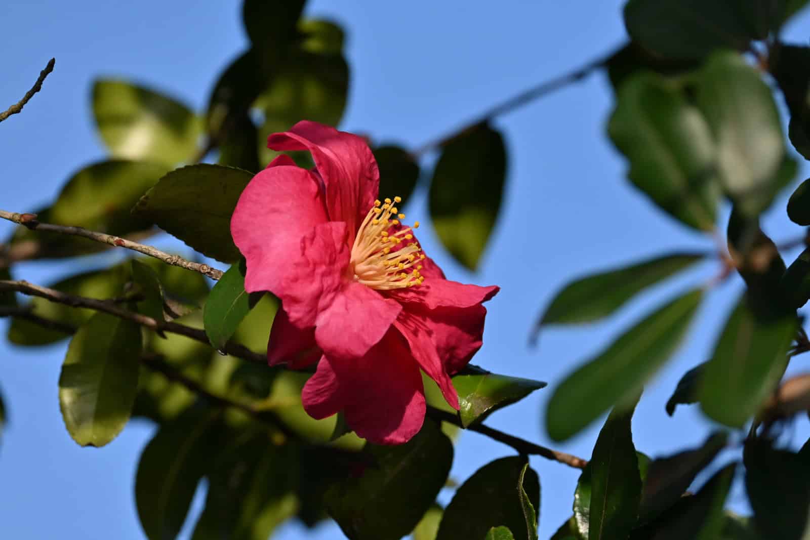 Yuletide Camellia offers striking red flowers with dark green leaves. This evergreen shrub blooms during the holiday season, making it a festive addition to winter gardens. It grows to about 8 feet tall and maintains a neat, upright form without much pruning. The glossy leaves stay attractive all year, while the bright red flowers with yellow centers provide color when most other plants are dormant. This camellia does best in partial shade and makes an excellent foundation plant or hedge.