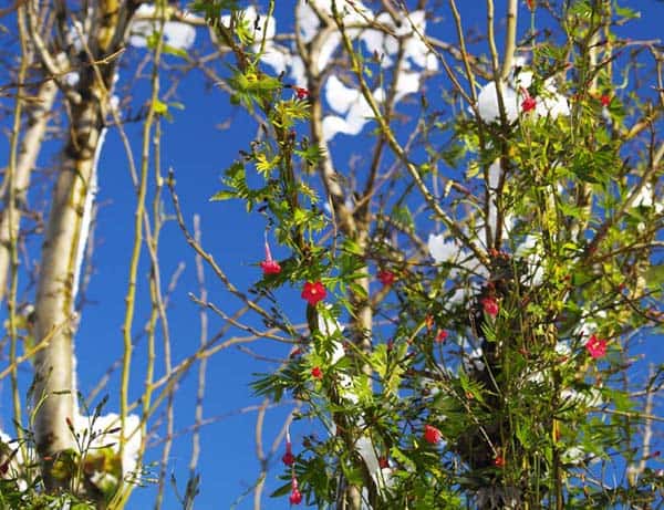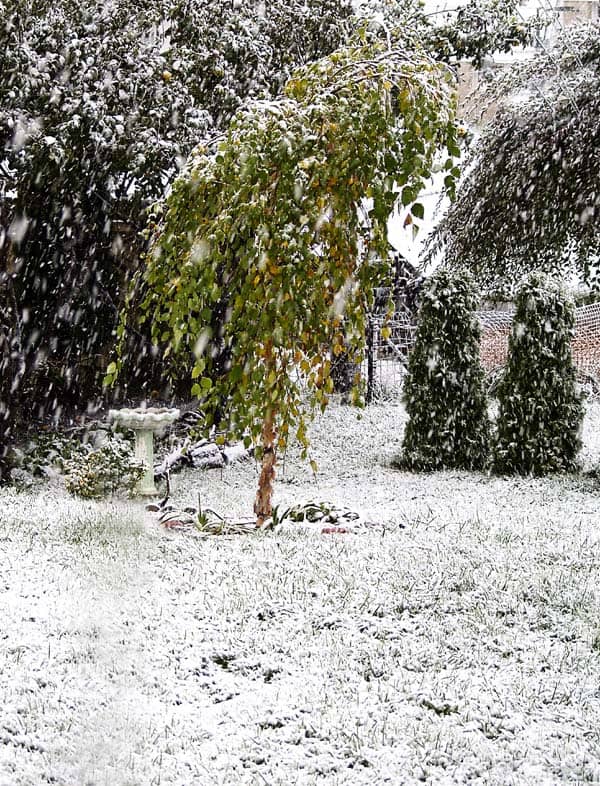 As far as my garden was concerned, it was naturally the end of the season and few plants remained, but leafy greens were wiped out and raspberry brambles, still covered with leaves, suffered heavy damage. Fortunately, all of my trees survived, but our Dogwood pictured below had a close call. Just after the storm, the weight of the wet snow bent some of its branches to the ground. We quickly cleared as much as we could reach with brooms and shovels.