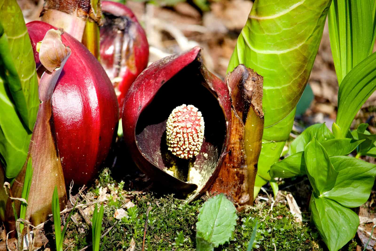 Skunk cabbage features large, glossy leaves that grow directly from the ground, and its bloom is a fleshy, purple flower that resembles something more fitting for a swamp. Its smell, which is comparable to rotten meat, only adds to its unappealing nature. However, this plant is vital for early-season pollinators, especially flies, which it attracts with its foul odor.