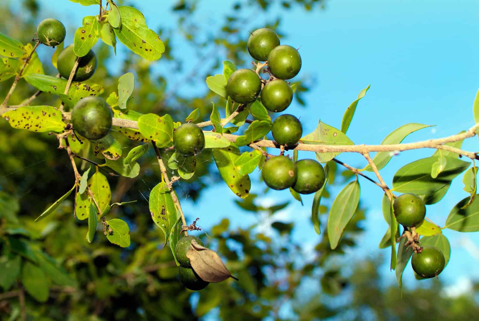 Strychnos nux-vomica, commonly known as the strychnine tree, is native to India and Southeast Asia. The seeds of this tree yield strychnine, a potent toxin that causes paralysis and death by respiratory failure. There is no antidote for strychnine poisoning. Historically used in rat poison, it gained infamy through Dr. Thomas Neil Cream, who used it to kill several people in the late 19th century. Despite its dangers, strychnine is still found in low doses in some street drugs and as a performance enhancer.