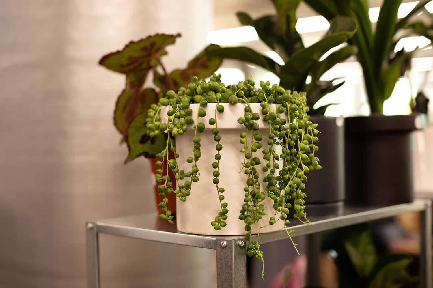 The String of Pearls is a unique, trailing succulent with small, bead-like leaves that resemble a strand of pearls, perfect for a hanging basket or high shelf. This plant needs indirect light with minimal watering. It does well in moderate humidity levels, making it suitable for most indoor environments. For optimal growth let the soil be dried completely between waterings, and avoid overwatering, as this succulent is prone to root rot. Its cascading vines add a graceful, decorative touch to any room, while remaining easy to care for.
